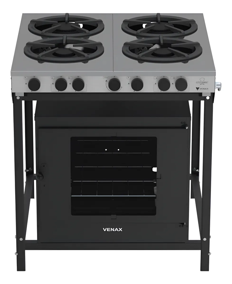 Fogão Industrial FFI 430-2 Gourmet, Baixa Pressão, 2 queimadores duplos de 150mm e 2 Queimadores de 120mm, Trempes de Ferro Fundido com diâmetro 30 cm, Queimadores e Espalhadores em Ferro Fundido pintados de Preto, Painel e Mesa de Aço Inox, Manípulos Removíveis, Bandeja Coletora de Resíduos, Forno de 109 L com Visor na Porta, Forno Easy Clean com Uma Prateleira Regulável.