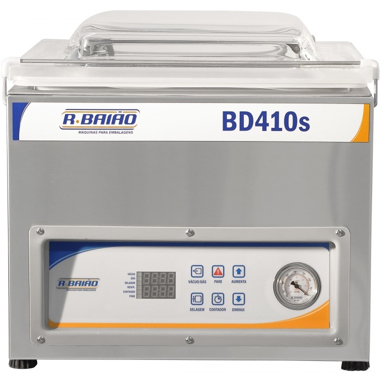 A Seladora a Vácuo de Câmara BD410s, é construída em estrutura de aço inox 304, com tampa de acrílico de 20 milímetros, barra de selagem em fibra de vidro acionada por cilindros, garantindo maior durabilidade e cuba com cantos arredondados para facilitar a limpeza. Possui painel digital impermeável de acordo com a classificação IP65, contador de processos e botão “PARE” para interromper o processo em qualquer estágio, caso seja necessário.